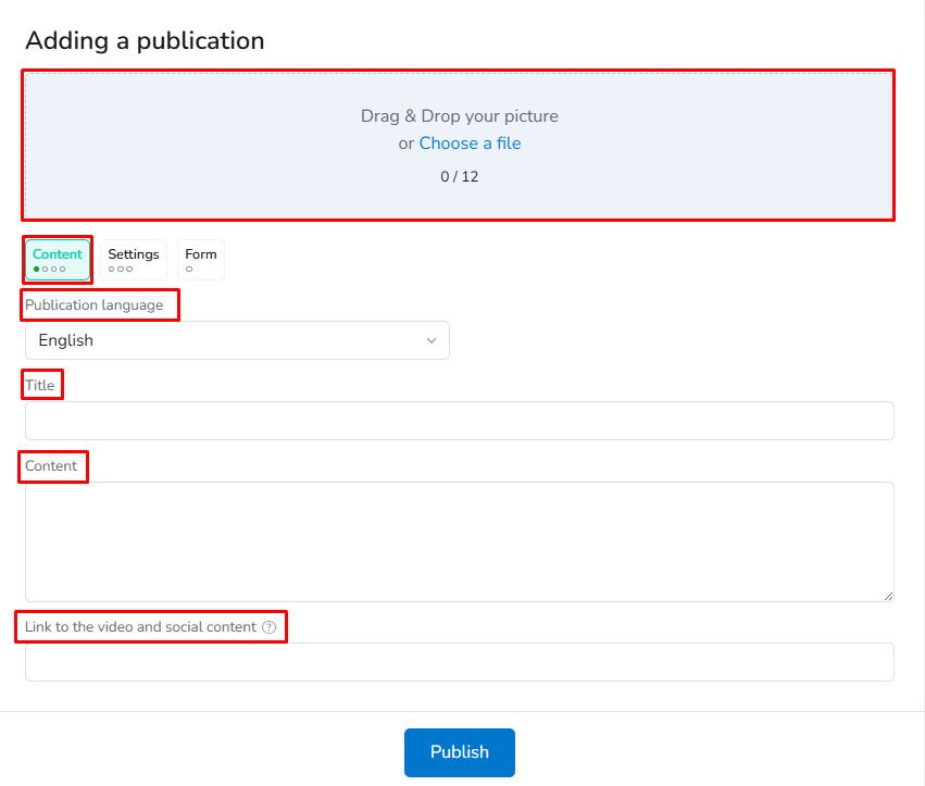 • Upload photo - add a photo for publication; you can also rearrange the images by dragging and dropping them. The first photo automatically becomes the main photo in the publication.