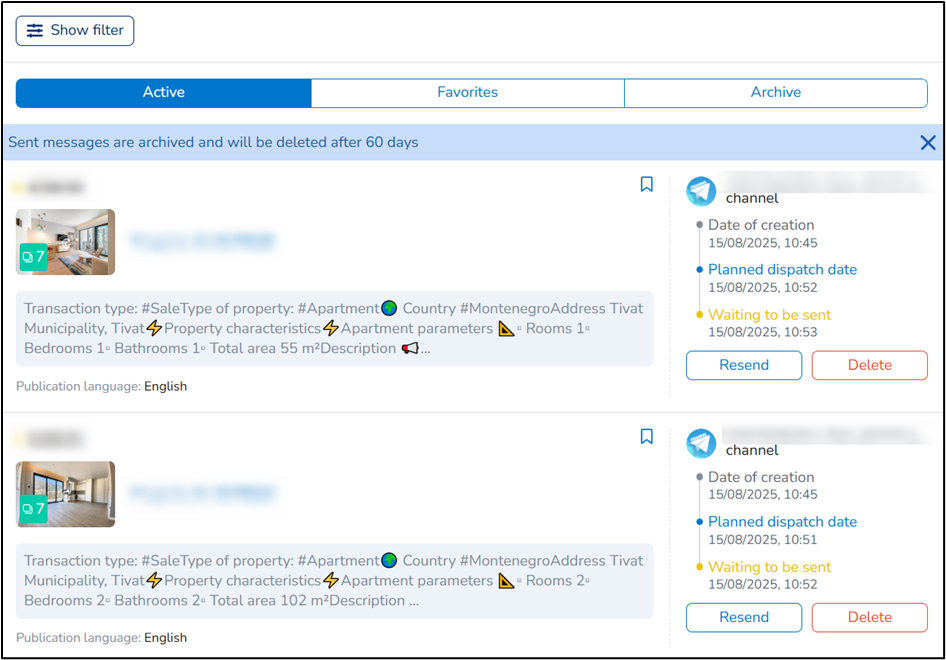 - Sending settings: After selecting a channel/group, you will be able to view the message and select the sending time: