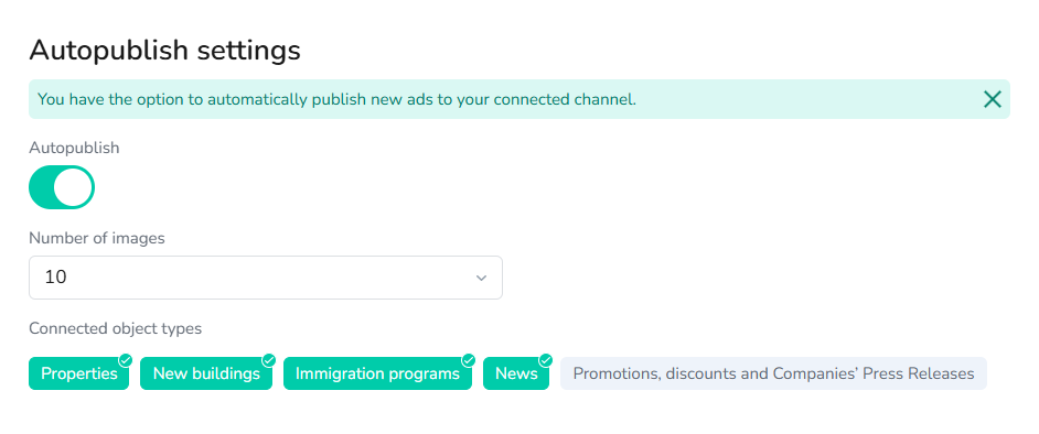We have prepared a simple guide for you on how to connect your group or channel to set up automatic posting of real estate properties. Please follow these steps: