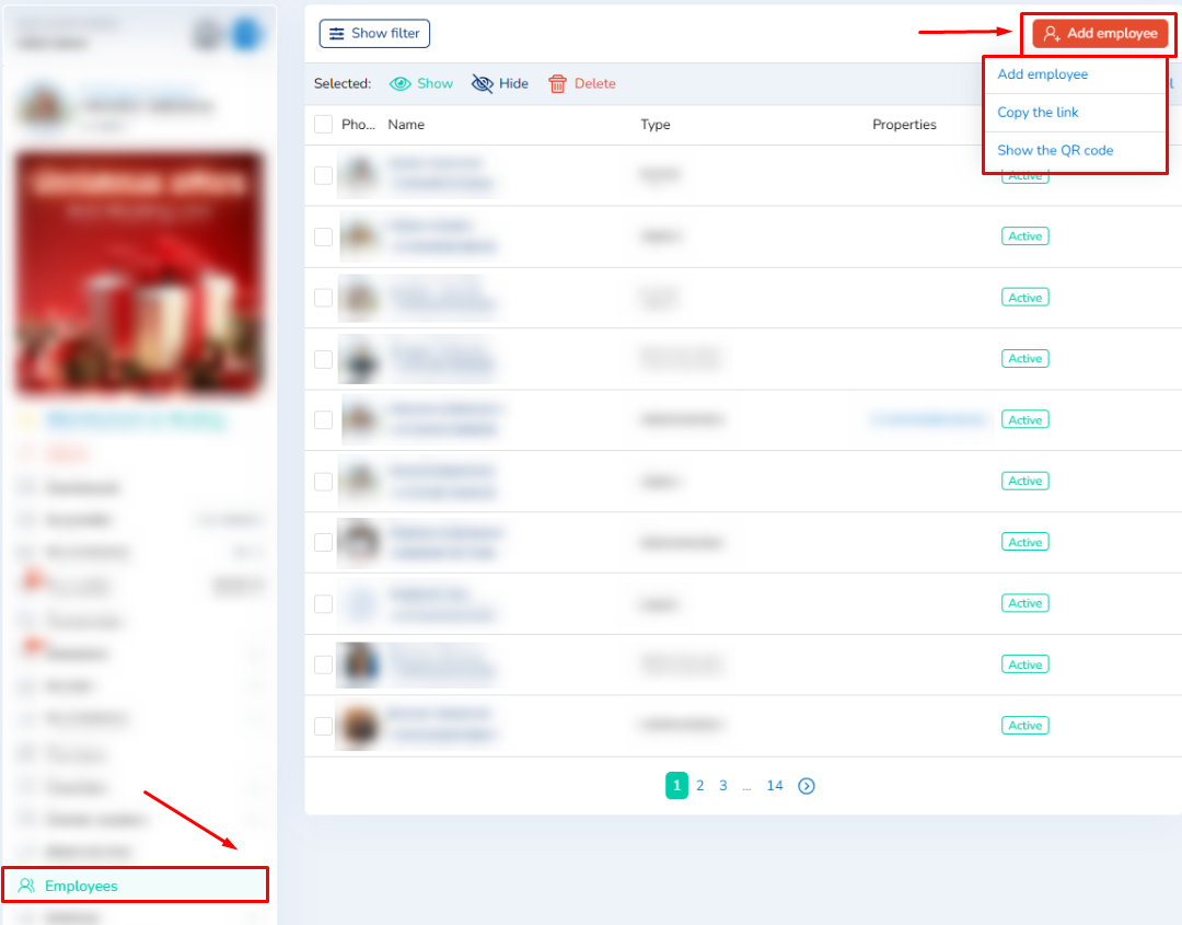 Select the method of adding (manually, via a link or QR code), and after registration the employee will appear in the list.