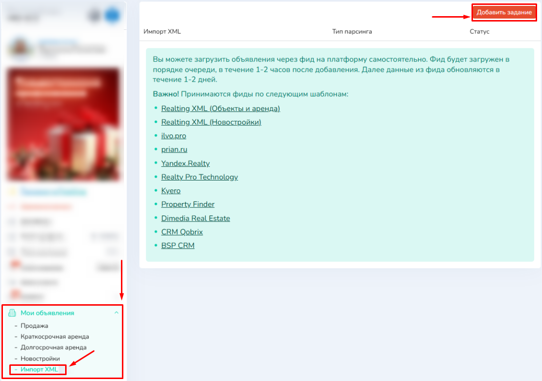 2. Добавить ссылку на XML-файл в разделе «Мои объявления»- «Импорт XML». Либо прислать её своему менеджеру для добавления.