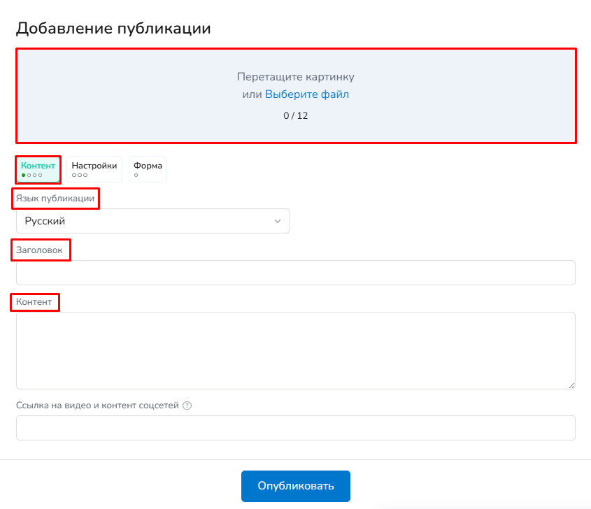 Заполните все необходимые поля в первой вкладке «Контент»: