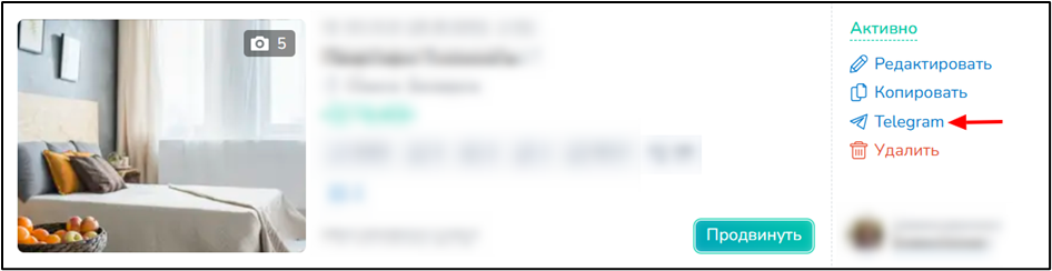 3. Выбор объекта: Найдите нужный объект и убедитесь, что он находится в статусе «Активно». Нажмите на значок Telegram рядом с объектом для начала публикации.