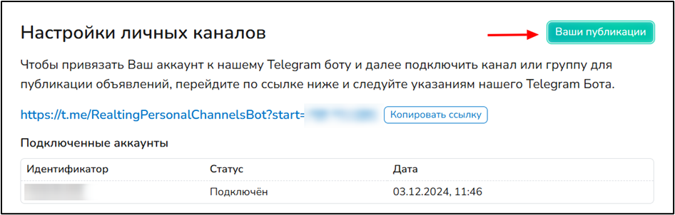 3. Отслеживание публикаций: После отправки вас перенаправит на страницу, где вы можете отслеживать статус ваших публикаций. Также этот раздел доступен по кнопке «Ваши публикации» в разделе «Настройки»-«Публикации» (см. скриншот ниже).