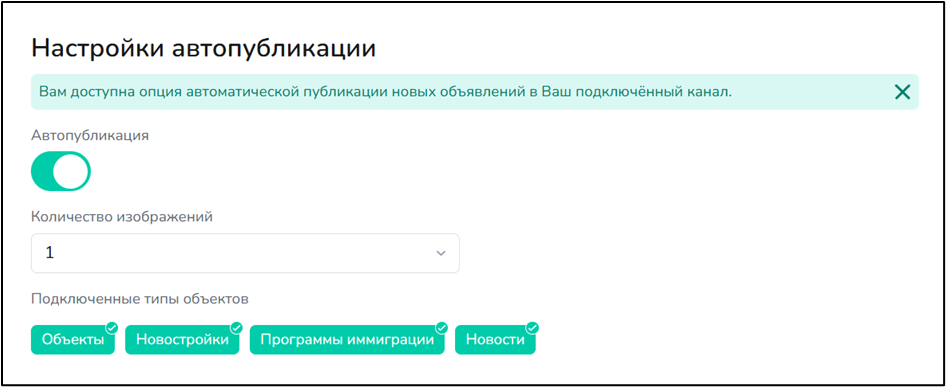 1. Что такое автопубликация? Это функция, которая автоматически публикует новые объекты недвижимости, которые вы загружаете, в ваш подключенный телеграм-канал.