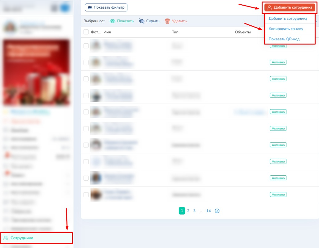 выбрать способ добавления (вручную, через ссылку или QR-код), и после регистрации сотрудник появится в списке.